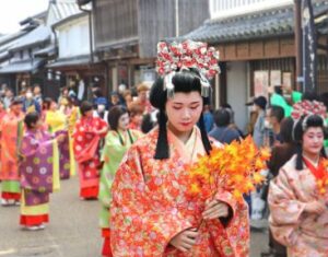 東海道53次の47番目の宿場町として、参勤交代や伊勢参りで賑わった「東海道関宿」。今でも1.8キロにわたり、200棟以上の町家が保存され、当時の風景がそのまま残っています。この風情あるまちなみを、関の山車や鈴鹿馬子唄の隊列を含む「宿場大行列」が練り歩き、まるで江戸時代にタイムスリップしたかのよう