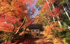 京都市西京区にある浄住寺は、平安時代に嵯峨天皇の勅願で創建された黄檗宗の禅寺です。静かな環境で紅葉を楽しめる、京都の隠れた紅葉スポットとして注目されています。11月中旬から下旬にかけて、境内全体が美しい紅葉に包まれ、鮮やかに染まる石段の風景は見事です。12月上旬には、散り紅葉が石畳や庭園を彩り、