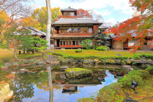 紅葉スポットとして知られる旧三井家下鴨別邸は、1925年(大正14年)に完成し、重要文化財にも指定された歴史ある建物です。11月下旬から12月上旬にかけて紅葉の見頃を迎えます。最寄りの出町柳駅から徒歩5分とアクセスも良く、豪商の邸宅ならではの優雅な雰囲気と、美しい庭園を背景にした紅葉が楽しめる、