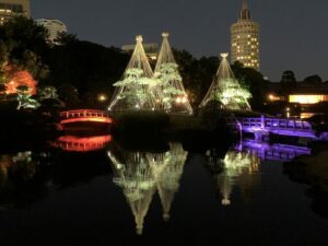 幕張新都心にある日本庭園「見浜園」では、美しい紅葉を背景にした幻想的なライトアップが楽しめます。季節の風物詩「雪吊り」のライトアップや、近隣の園児が作った可愛らしい灯ろう、和傘の演出など、園内全体が温かく照らされ、特別な雰囲気に包まれます。さらに、お箏やヴァイオリン、馬頭琴の音楽イベントや、気軽