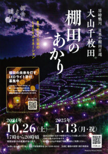 日本の棚田百選にも選ばれた大山千枚田を舞台に、LEDライトで棚田を彩る「棚田のあかり」が行われます。15分ごとに橙、青、緑、紫といった4色に変わるライトが美しい棚田を照らし、幻想的な光景を楽しむことができます。秋から冬にかけて行われるこのライトアップは、季節を感じる風物詩として、多くの人々に愛さ