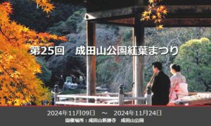 成田山公園は、成田山新勝寺大本堂の奥に広がる約165,000平方メートルの広大な公園です。紅葉の時期には、モミジやイチョウなど約250本の木々が色づき、趣ある美しい景観を楽しむことができ、毎年多くの観光客が訪れます。期間中の土・日・祝日には、市内の茶道団体によるお茶会や、箏・尺八、二胡などの伝統