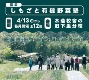 有機の里として全国に知られる埼玉県小川町下里集落で、1971年から有機農業に取り組んできた「霜里農場」。 初心者から受講可能で、有機農業の技と思想を通じ、土づくり、安全で美味しい野菜づくり、保存食づくりなどを学びます。 約1年間のプログラムで、まちの自然や魅力を存分に味わってみませんか。