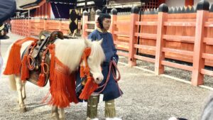「白馬神事」は、当社に伝わる特別な神事のひとつ。神馬「白雪号」が各本宮を巡り終えると、境内を元気に駆け巡る姿が見られます。年の初めに白馬を見ると、邪気が祓われるといわれています。 さらに、白馬神事当日には、特別なご朱印やお守り「竹駒守」が授与されるので、ぜひこの機会に手に入れてみてください。新し