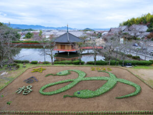 安倍文殊院では、毎年その年の干支をテーマにした「ジャンボ干支花絵」を公開しています。2025年(乙巳)は「巳んなが笑顔に」という願いが込められたデザインです。 花絵には、参拝者の災難を払う魔除けとして親しまれている「五芒星」や、頑張る受験生を応援するメッセージとして葉牡丹で描かれた「合格」の文字