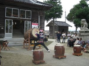 下後亟神明宮の秋祭りにて、力強い源氏太鼓が盛んに打ち鳴らされます。この太鼓は、寿永2年の砺波山源平合戦の際、源軍に味方した蟹谷郷の住人、蟹谷次郎が村人たちを率いて行った「かたどき太鼓」と伝えられています。彼らは山麓の南から盛んに火を焚き、太鼓を打ち鳴らして大軍を装い、平軍に圧力をかけました。その