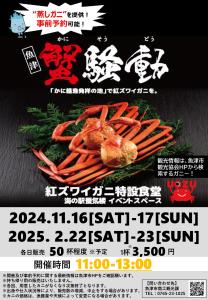 昨冬、大盛況だった「魚津 蟹騒動」が、今年も好評につき再び開催決定!紅ズワイガニが旬を迎える11月と2月に行われます。「魚津 蟹騒動」では、カニ本来の旨味をさらに引き立てる「蒸しガニ」で提供され、とろけるようなカニ味噌と肉厚な身が堪能できます。この季節ならではの紅ズワイガニを存分に味わってくださ