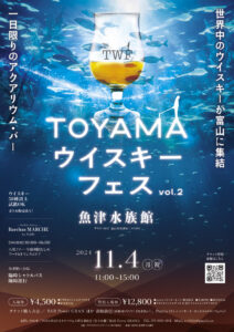 魚津水族館を全面貸し切り、国内外のウイスキーを楽しめる特別なイベントが開催されます。ウイスキーの蒸留所、メーカー、インポーター、酒飯店、バーなどのブースが並び、50種類以上のウイスキーの試飲が可能です。一部のウイスキーはボトル販売もされているので、お気に入りを持ち帰ることもできます。屋外では「バ