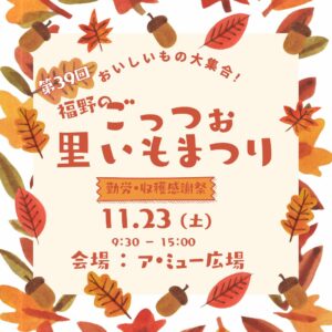 明治時代から里いもの生産が盛んな富山県福野で、旬の里いもを祝う収穫感謝祭が開催されます。ア・ミュー広場では、福野で収穫された新鮮な里いもが販売されるほか、ダイコンやハクサイなど地元農業高校の学生が栽培した野菜の即売会も行われます。また、里いもを使ったテイクアウトグルメや、地元の団体や飲食店による