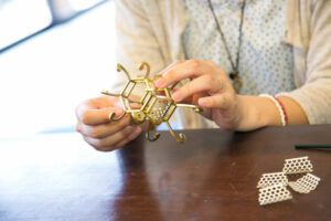 国指定伝統的工芸品「山鹿灯籠」。 和紙と少量ののりだけで作られる山鹿灯籠は、その繊細さと美しさから和紙工芸の極致とも評されます。 現役の灯籠職人に習って、手のひらサイズの金灯籠を作ってみませんか? 本物の灯籠と同様、約30個の部品を組み立てると、キラキラ輝くミニ灯籠が完成します。 骨組みに美しく