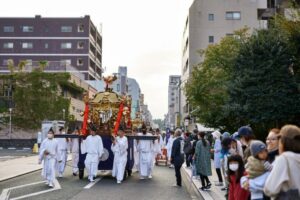 かつて藤崎八旛宮は熊本城内に鎮座していましたが、明治10年の西南戦争で被災し、現在の場所へ約3km東に移転しました。神幸式では、御祭神である応神天皇、住吉大神、神功皇后の御分霊が三基の御神輿に遷され、かつての古宮跡である御旅所を目指して、城下町熊本の中心市街地を練り歩きます。
