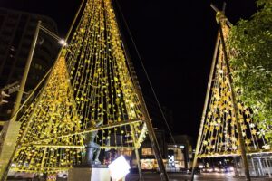 金沢市民の台所である近江町市場の周辺エリアでは、冬の風物詩として金箔を使ったモニュメント「金箔きらら」が輝きます。金沢の冬の準備としておなじみの雪吊りに、伝統工芸の金箔をあしらい、やさしいLEDの光で照らし出された様子はとても華やか。澄んだ冬の夜の空気とともに、心あたたまるひとときをお過ごしいた