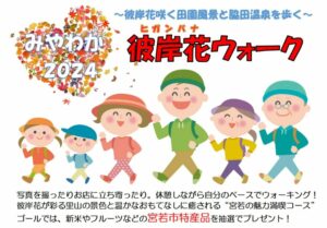 彼岸花が彩る田園風景と川のせせらぎに包まれた、のどかな景色と温かなおもてなしを楽しむ脇田温泉周辺のウォーキングイベント。コース沿いには農産物直売所や地元食材を使ったカフェ・レストラン・パン屋、俳句の道、川沿いの遊歩道、鎮守の森など、多くの立ち寄りスポットやフォトスポットが点在しています。ゴールで
