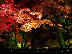 来場者に夜の紅葉を楽しんでもらうため、角館武家屋敷通りがライトアップされます。長い年月を経た古木や巨木が、黄葉から紅葉へと色づいていく様子は見事です。夜のライトアップに照らされた樹木たちは、昼間とは違う幻想的な姿を見せてくれます。自然と歴史が調和した夜の角館、その美しさとともに深まる秋を感じなが