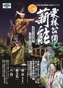 特別名勝の栗林公園では、その魅力やブランド力を高め、国内外からの観光客を誘致するために、かつて藩主の下屋敷があった檜御殿跡に紫雲山を背景とした野外仮設舞台を設けます。ここでは、歴代藩主が楽しんできた「能」の舞台公演(薪能)を開催します。出演者には、能楽界を代表する人間国宝の茂山七五三さんや大倉源