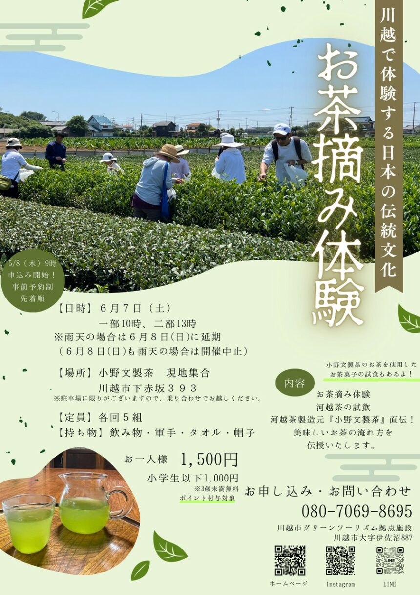 画像出典: https://kawagoe-gt.jp/event/4892 お茶摘み体験~川越市内のお茶農家・小野文製茶協力~:2025年6月7日