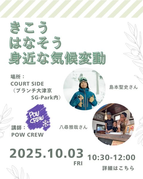 滋賀県大津市で環境保護活動をされているPOW CREWの島本聖史さん、八尋雅哉さんをお招きし、気候変動とエネルギーの課題についてお話いただき、気候変動を解決するために、私たちは何ができるのか、私たちの暮らしと気候変動についてみんなで考えてみたいと思います。