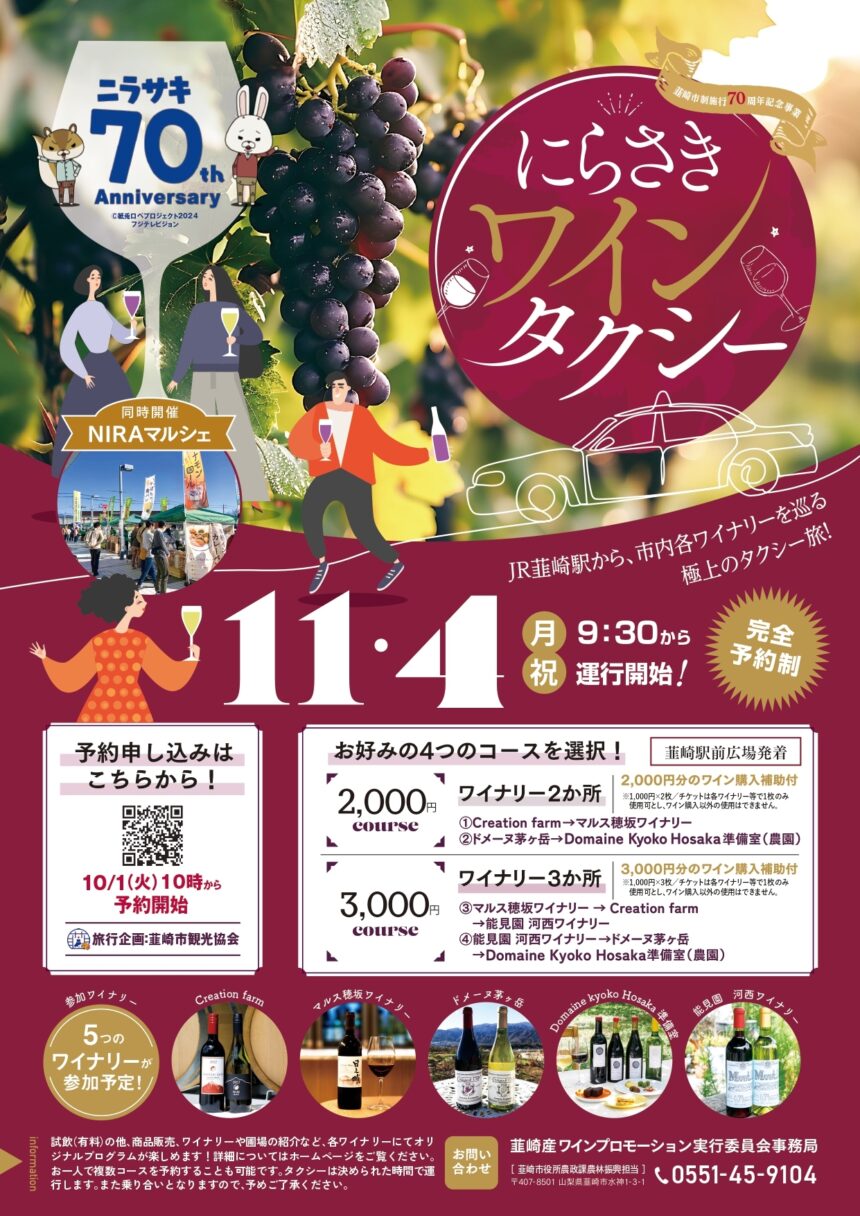 JR韮崎駅を出発点に、市内の4つのワイナリーと、開設予定の農園をタクシーで巡る「にらさきワインタクシー」が運行されます。各ワイナリーでは、有料の試飲や商品販売(ワイン購入補助チケット付き)、ワイナリーの紹介など、ここでしか体験できないオリジナルプログラムを楽しめます。コースや詳細、予約については韮崎市観光協会のホームページをご確認くださいね。
