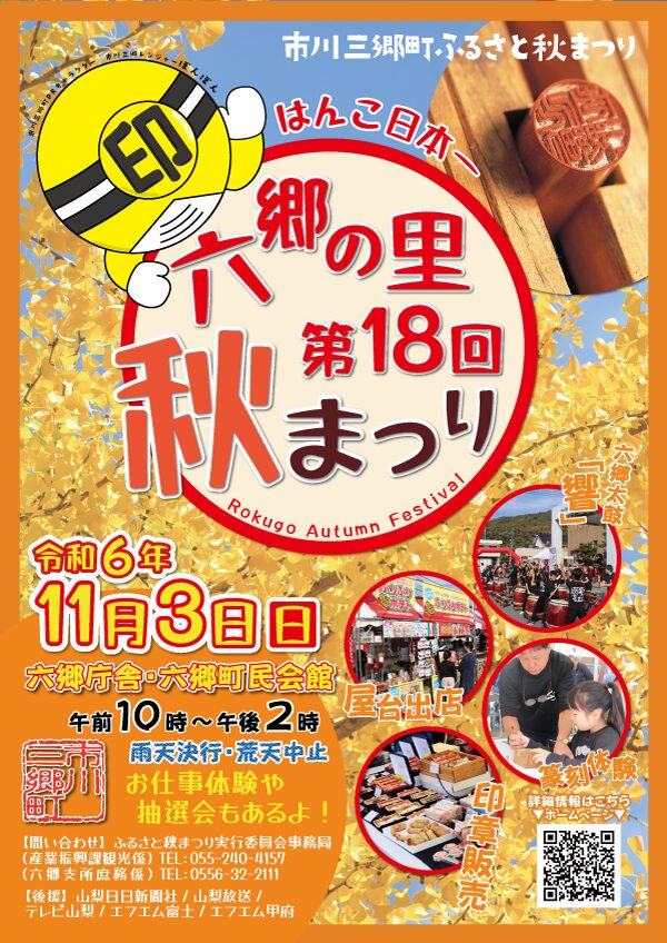 画像出典: https://www.town.ichikawamisato.yamanashi.jp/50sightsee/60festival/2013-0917-1434-12.html はんこ日本一 六郷の里秋まつり:2024年11月3日