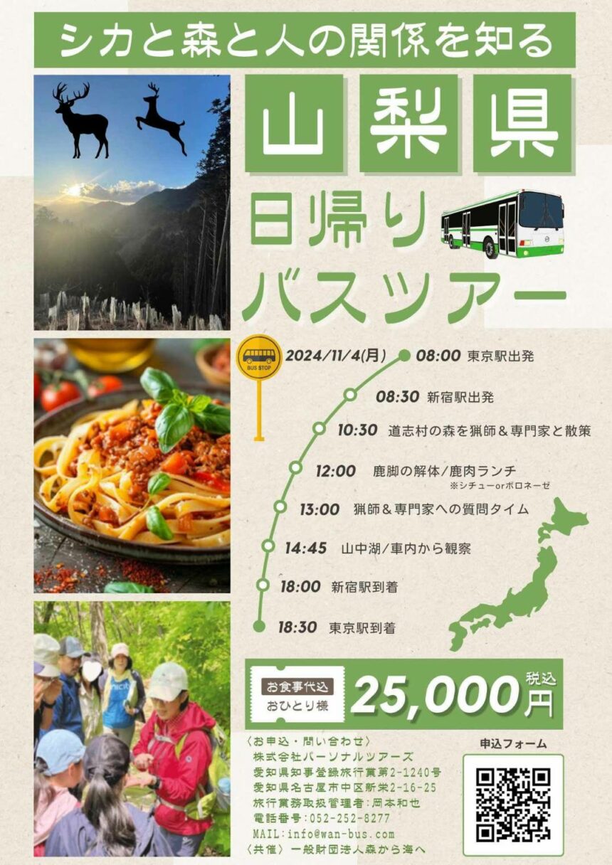 画像出典: https://docs.google.com/forms/d/e/1FAIpQLSd7d0QAbTzESZR0irrUwZOfnzHvppkO_39rfcXk32TLRi5yhQ/viewform シカと森と人の関係を知るツアーin山梨県道志村:2024年11月4日