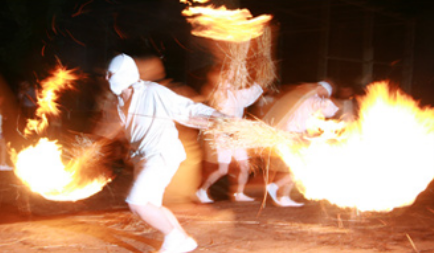 応安3年(1370年)、大宝八幡宮が出火した際、大宝八カ寺の中心であった賢了院が、畳と鍋蓋を使って火を鎮めたという伝承があります。この伝説を儀礼的に再現する祭りでは、白装束をまとった奉仕者たちが松明・畳・鍋蓋を手にし、火の粉を浴びながら境内を駆け巡ります。激しく燃え上がる炎を囲み、鍋蓋や畳を力強く石畳に叩きつける姿は、古の勇壮な情景を彷彿とさせ、見る者の心を奮い立たせます。