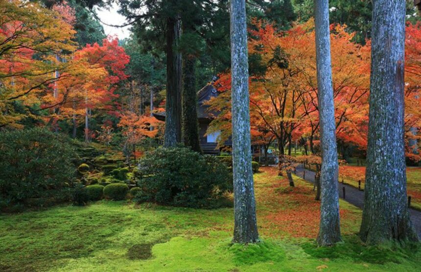 かつて建礼門院が隠棲した山里、大原。その散策の中心にある三千院は、国宝の阿弥陀三尊像をはじめ、たくさんの文化財が大切に守られている天台宗のお寺です。紅葉の季節になると、杉木立に囲まれた有清園や聚碧園、そして往生極楽院をはじめとする境内全体が美しい秋の彩りに包まれます。特に、寒暖差がもたらす鮮やかな紅葉と、苔の緑の美しいコントラストは、息をのむほどの美しさです。