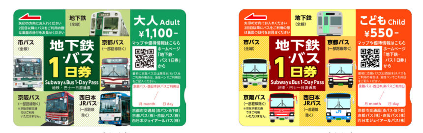 京都の地下鉄・バスが1日乗り放題になる乗車券で、大人1,100円、子供550円で販売されています。