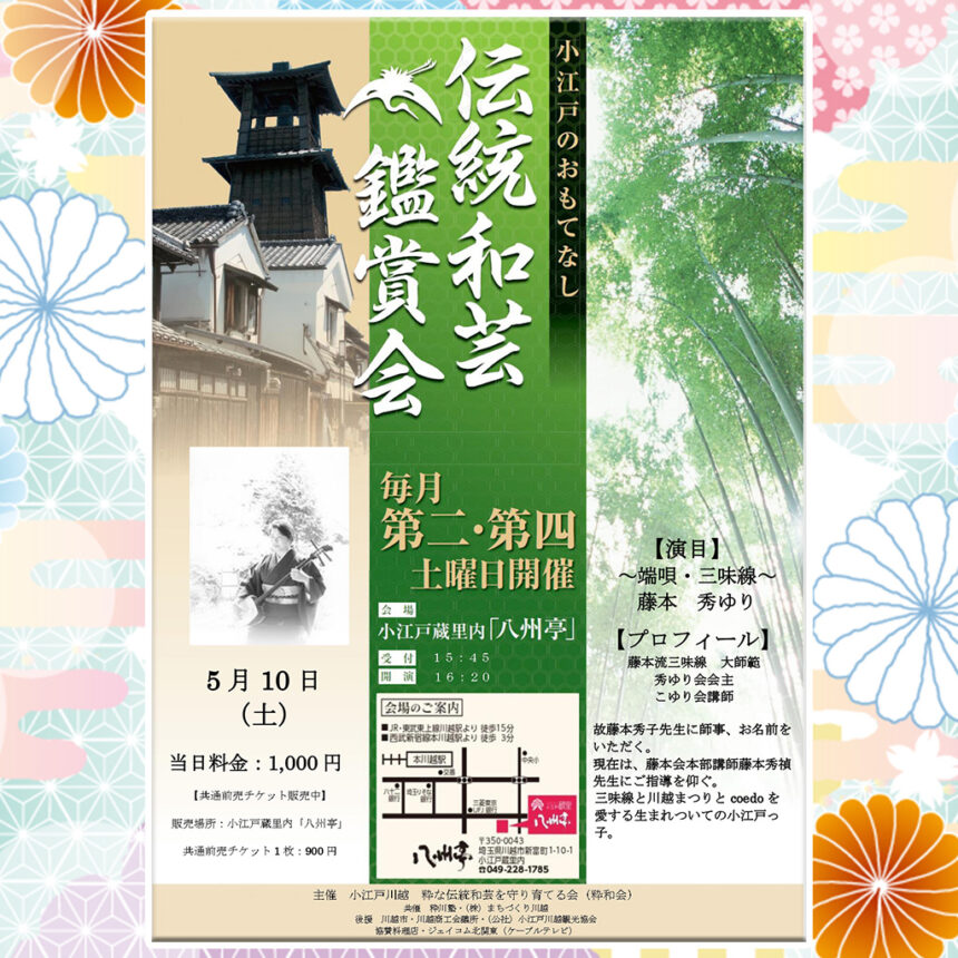 小江戸蔵里八州亭ステージにて月に2回。様々なアーティストによる伝統和芸鑑賞会が開催されています。川越観光の際は立ち寄ってみてはいかがでしょうか。