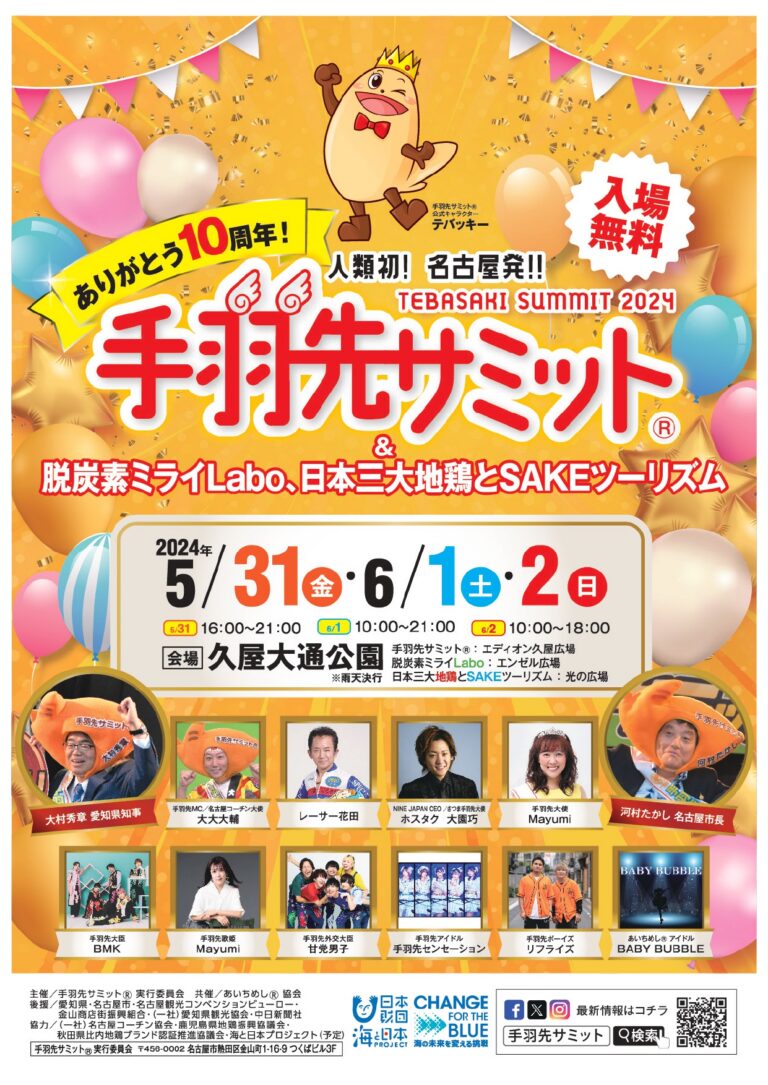 画像出典: https://tebasaki-summit.jp/ 手羽先唐揚げ発祥地の名古屋市熱田区から始まった「手羽先サミット2024」 開催日:2024年5月31日(金)~6月2日(日)