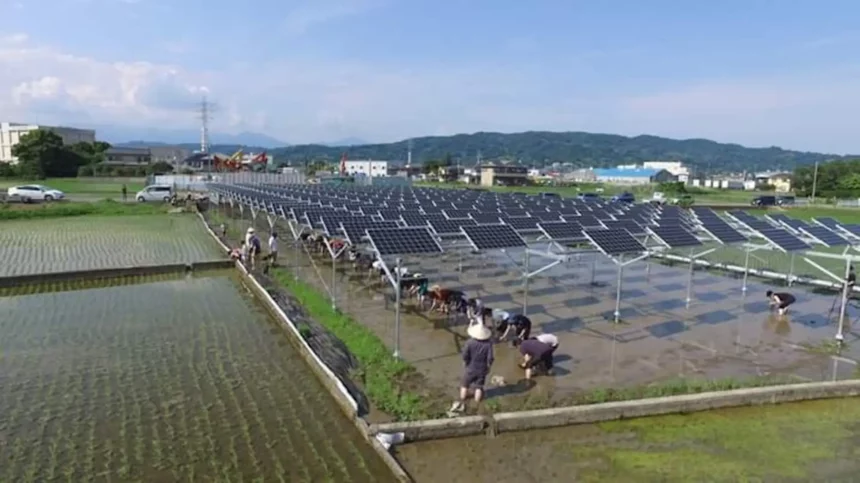 農地の上で太陽光パネルを並べ、米を育てながら電気も生み出す“ソーラーシェアリング”。