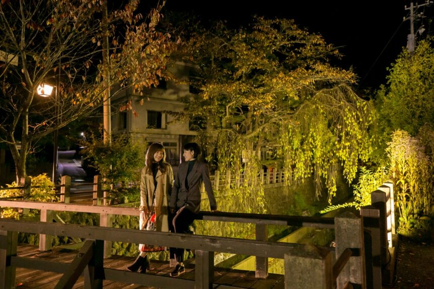 かつて高山城を囲んでいた江名子川では、川沿いの紅葉の木々が美しくライトアップされます。白壁の土蔵を背景に、紅葉の鮮やかさが一層引き立ち、素敵な景色が広がります。この美しい光景をぜひお楽しみください。