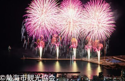 静岡県熱海市で1952年に始まったこの伝統的な花火大会は、夏だけでなく一年を通じて10回以上も開催され、熱海の風物詩となっています。会場となる熱海湾は、三方を山に囲まれた「すり鉢」状の地形で、打ち上げられる花火の音が山々に反響し、まるで巨大なスタジアムのような迫力ある音響効果を生み出します。さらに、水面に映る花火の光が幻想的な景色を描き、訪れる人々を魅了します。