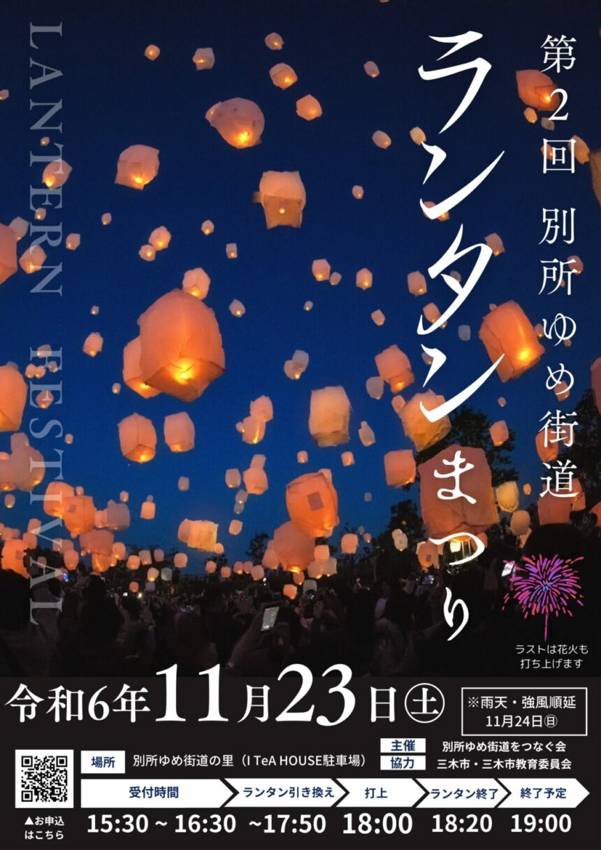 2008年に廃線となった三木鉄道の跡地を活用し、田園風景に囲まれた散策道「別所ゆめ街道」の中心地、別所ゆめ街道の里で第2回ランタンイベントを開催します。LEDライトで照らされたランタンの幻想的な光景をぜひ楽しんでください。イベントの最後には、約5分間で80発の花火が打ち上げられます。特別な夜をお楽しみに!