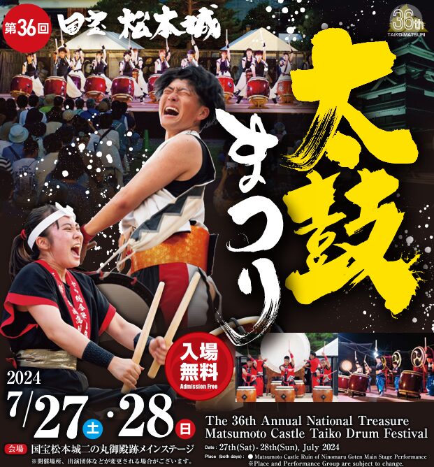 画像出典: https://www.city.matsumoto.nagano.jp/soshiki/76/133583.html 第36回国宝松本城太鼓まつり:2024年7月27日~28日