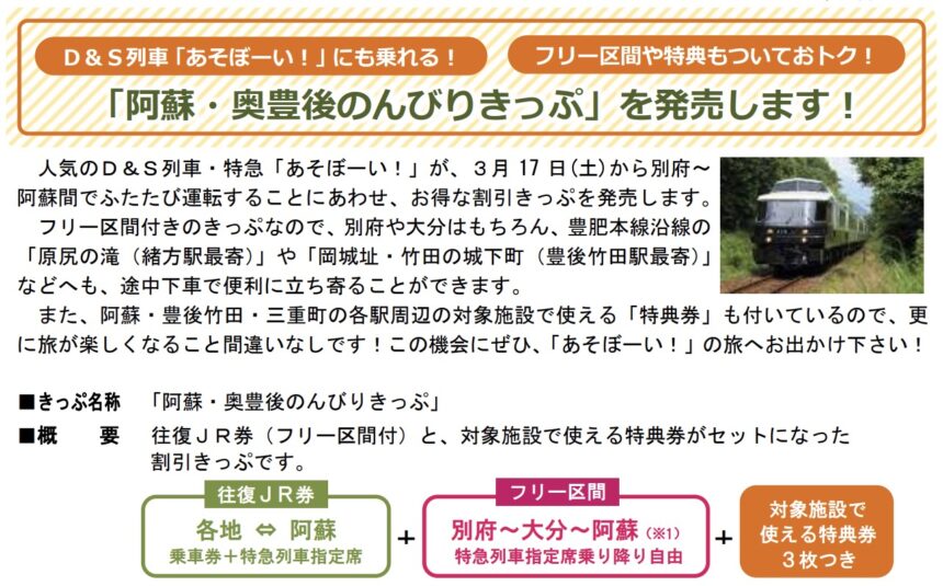 熊本または別府/大分から阿蘇方面に行くのに便利なきっぷです。