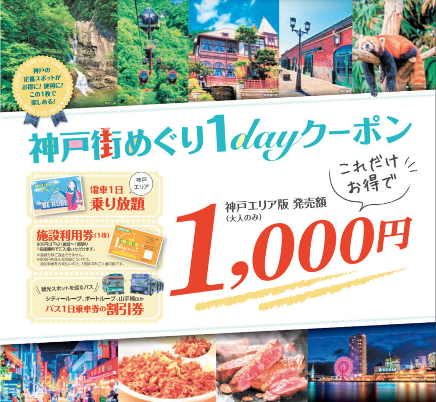 画像出典: https://www.feel-kobe.jp/app/wp-content/uploads/page/machimeguri1day/machimeguri_pf2023.pdf 電車乗り放題&観光施設1つのお手軽セット「神戸街めぐり 1dayクーポン」