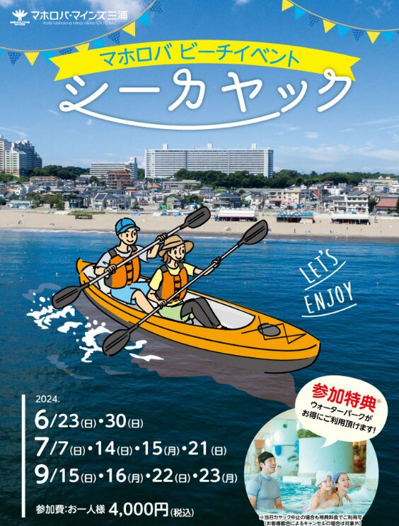 画像出典: https://www.maholova-minds.com/event/detail.php?CN=117849 2024 マホロバビーチイベント〈シーカヤック〉:2024年7月7日~9月23日