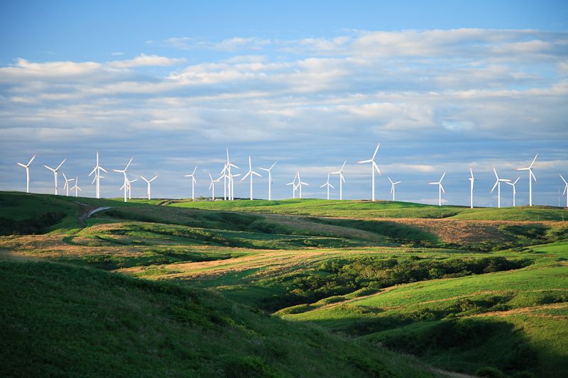 北海道の雄大な牧草地に57基の風力発電機が並んでいるユーラス宗谷岬ウィンドファーム。