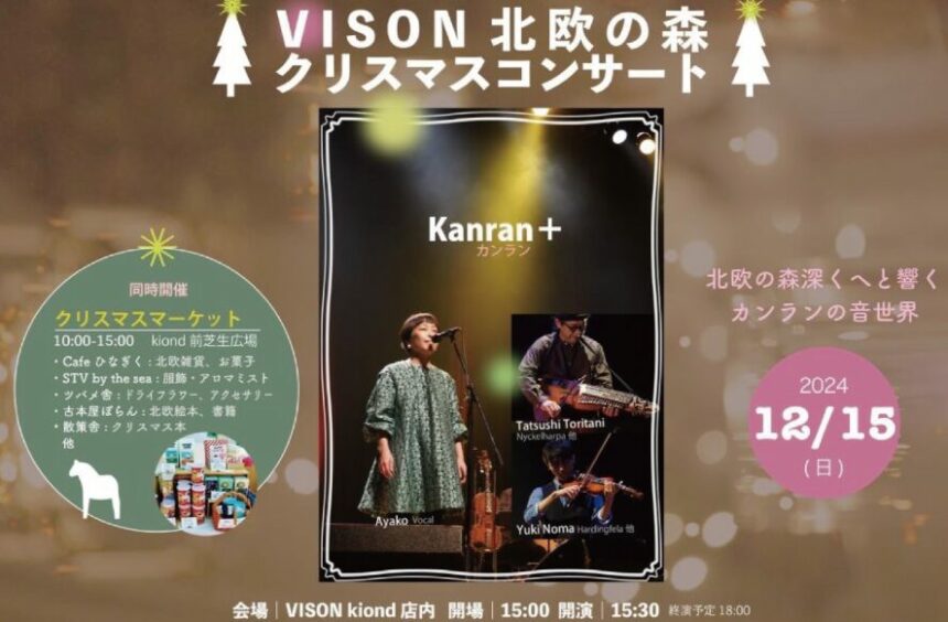 多気のVISON内にあるkiondで、北欧のクリスマスコンサートが開催されます。北欧音楽ユニット「カンラン」とゲストの野間友貴さんが、心温まる北欧フォークミュージックをお届けします。また、kiond芝生広場では朝10時から「北欧の森クリスマスマーケット」も同時開催!北欧の魅力をたっぷりと楽しめる一日を、ぜひお楽しみください。