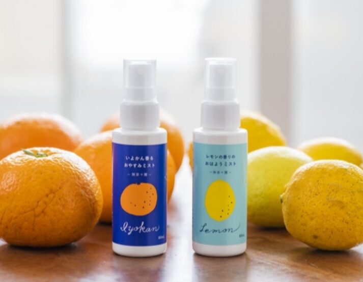 ジュースを搾る際に使った柑橘果皮からとれる精油や蒸留水を使って、伊予間とレモンのアロマミストを作っています。
